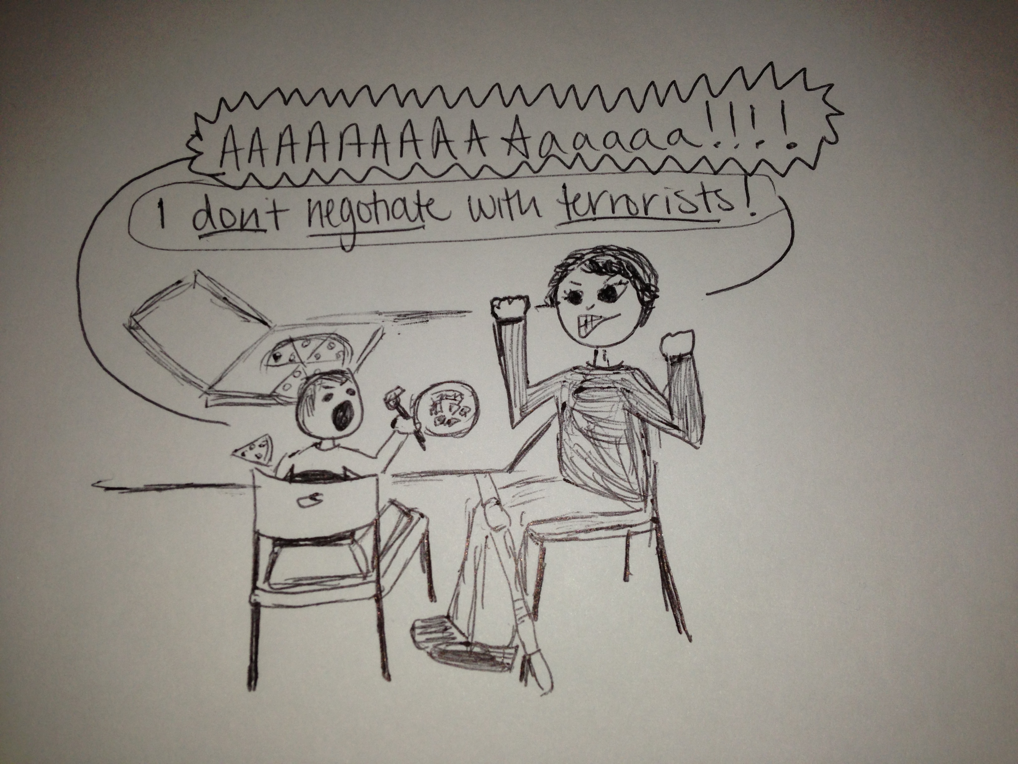 My baby is becoming a two year old. Or a sociopath. I can’t figure out which. Example from tonight at dinner (which was pizza, by the way… Pizza. The world’s least objectionable food).